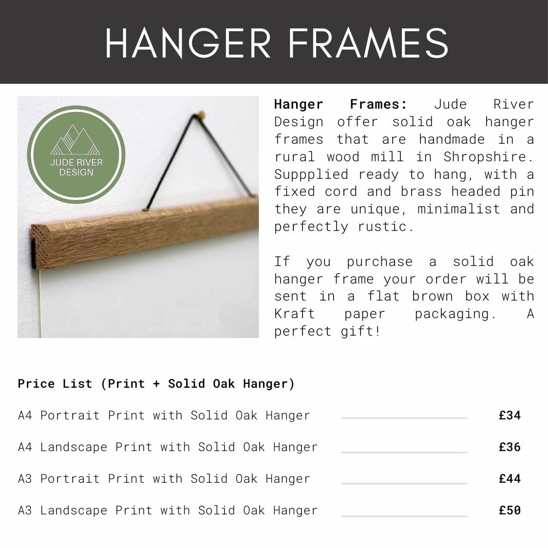 All of my prints are printed on a beautiful 100% cotton 316gsm museum quality fine art paper. You can choose to receive the print only, or add a beautiful solid oak hanger frame to your order.